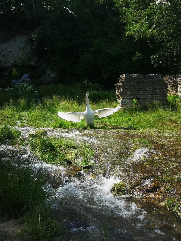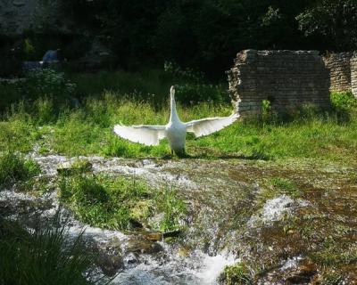• От древнего Труворова креста по каменистой тропинке спуститесь вниз — туда, где синеют воды Городищенского озера и бьют 12 Словенских ключей. Настоящие водопады, к бурлящим водам которых подплывают белые лебеди — дети будут в восторге.